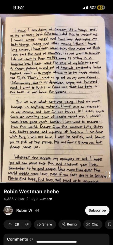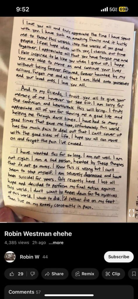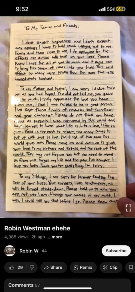 Westman demanded in the manifesto that his family “remember to be good people.” He also posted videos where he made strange sounds and laughed as he showed off a gun, ammo and more to the camera.