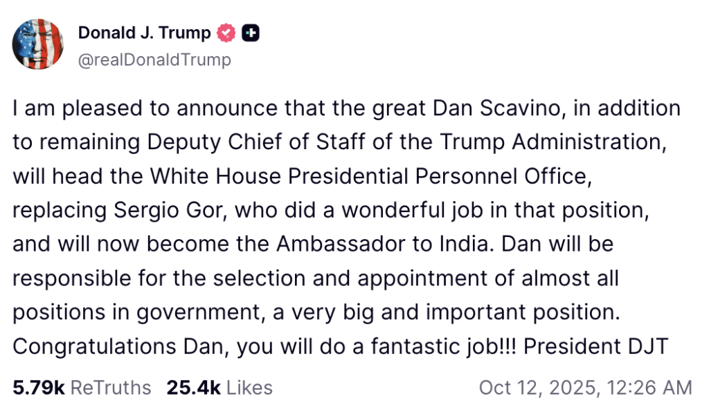 “I am pleased to announce that the great Dan Scavino, in addition to remaining Deputy Chief of Staff of the Trump Administration, will head the White House Presidential Personnel Office, replacing Sergio Gor who did a wonderful job in that position, and will now become the Ambassador to India,” Trump said on Truth Social.